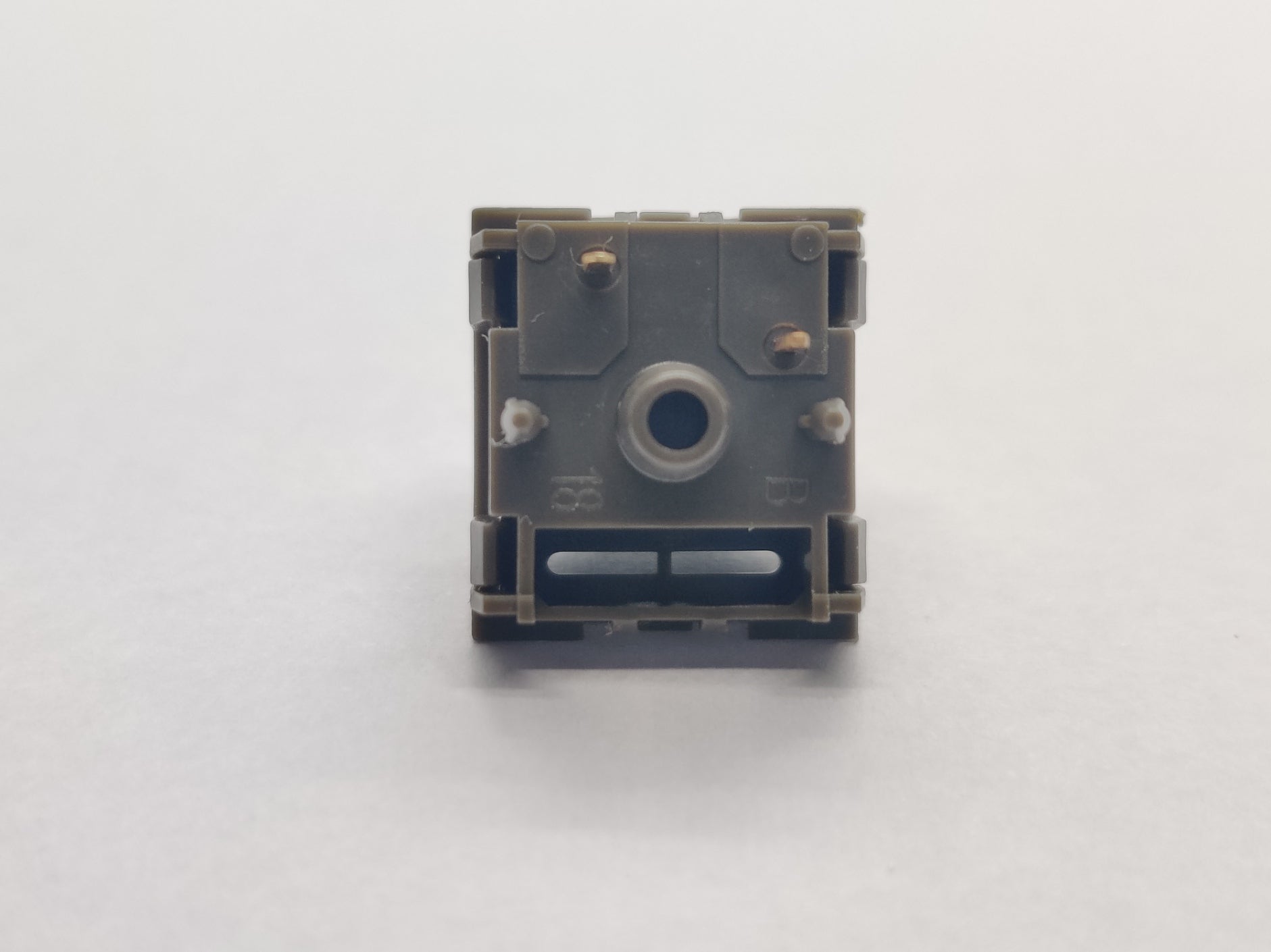In a very dark, but not quite black housing, the most interesting thing about these switches is, of course, their click mechanism. Using a "Snapple cap" system of the pole bottoming out on a convex metal disk that makes it click, these are the closest thing to a linear clicky switch you will find, although they are not great for quickly repeated presses due to their odd actuation.