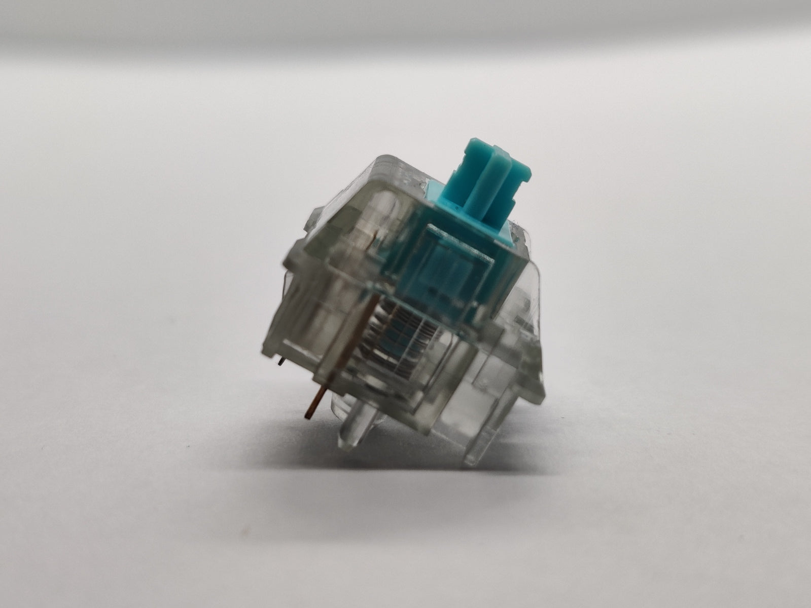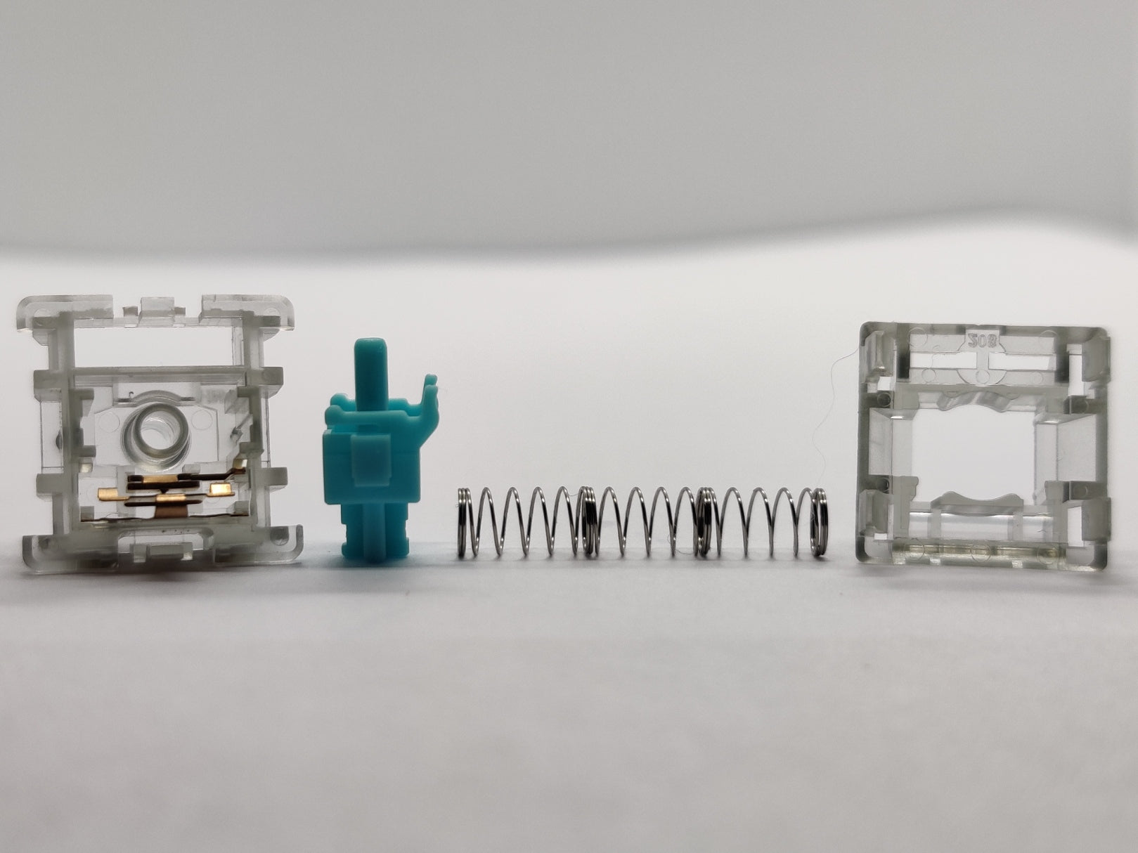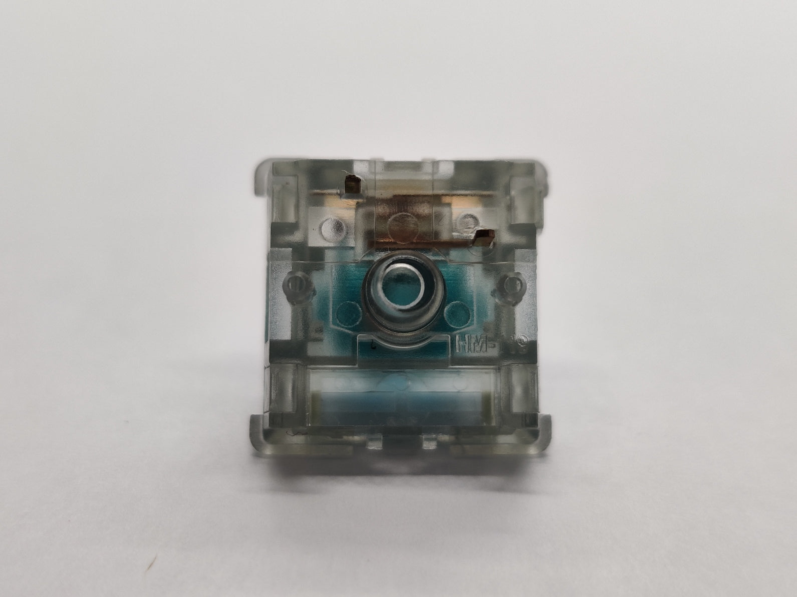 A light tactile switch from designer Old Tom. One of the earliest HaiMu switches we know of, back before they figured out that they could add silencing on the top of the rails too. These switches have such a sharp bump and such a light spring that they barely return, even with long multistage springs.